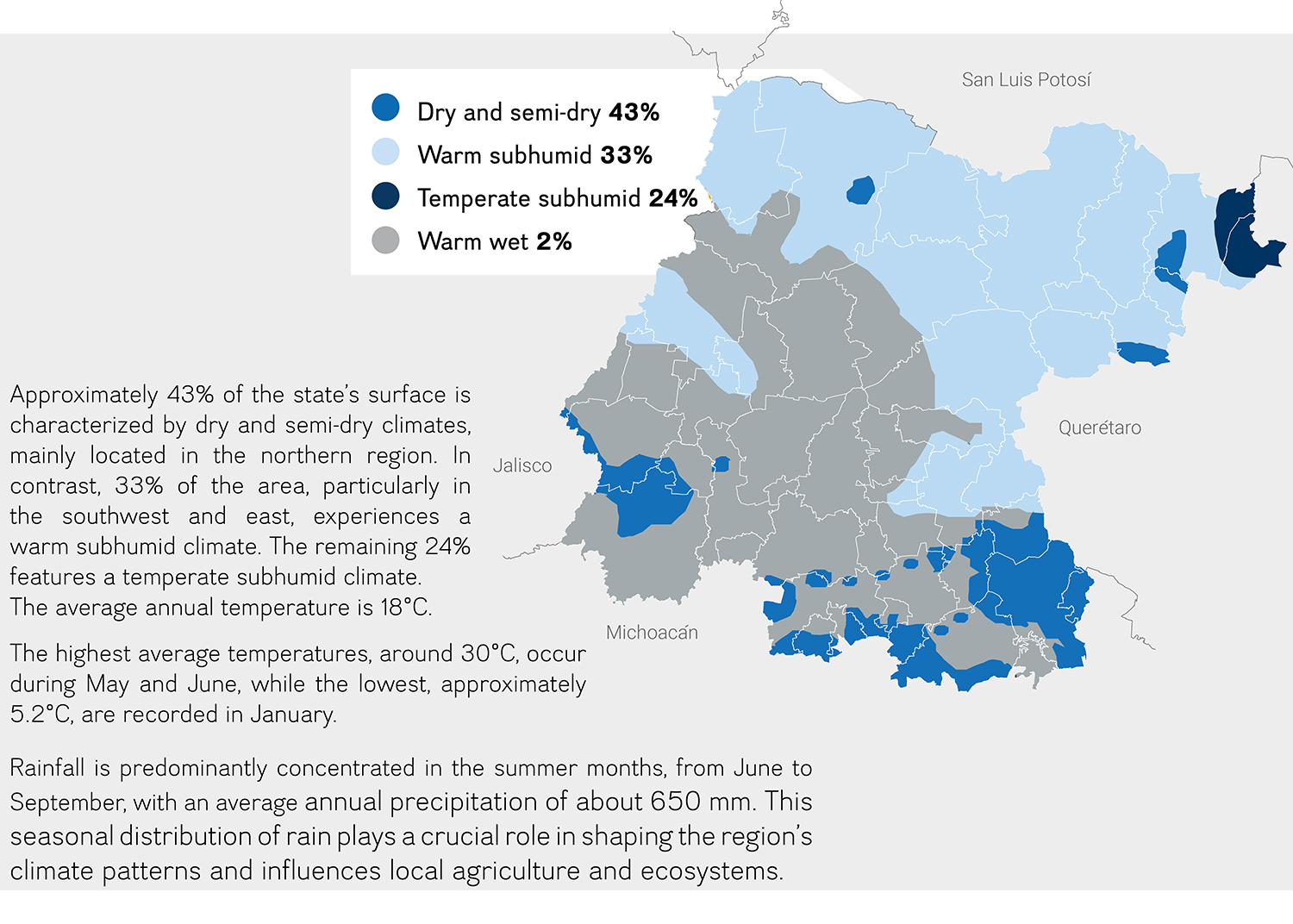 The 43% of the surface of the state is represented by dry and semi-dry climate located mainly in the northern region; 33% of the surface towards the southwest and east present itself sub-humid warm climate and the remaining 24% presents a temperate sub-humid climate.