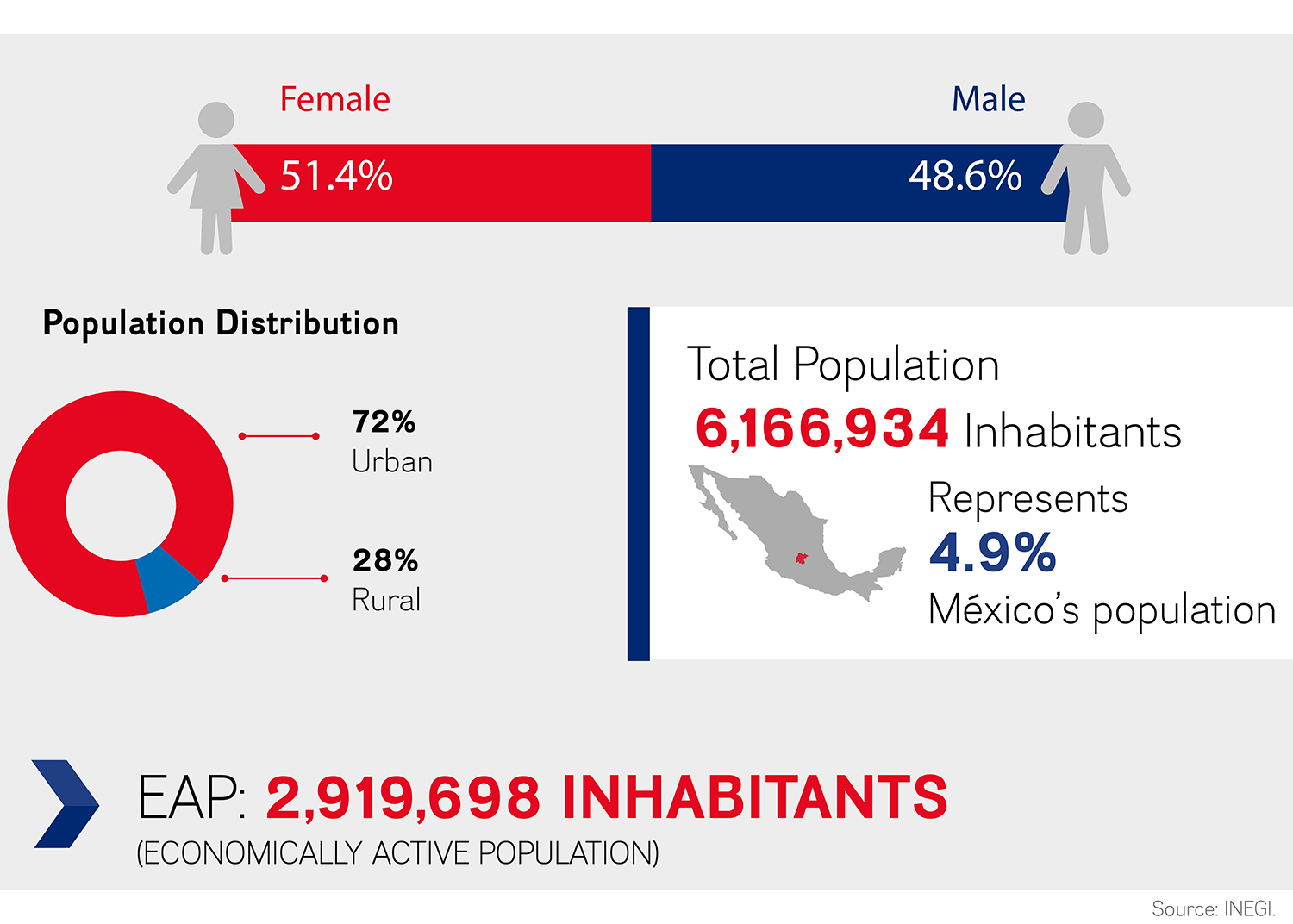 Guanajuato, one of the most dynamic states in Mexico, has a total population of 6,166,934 inhabitants. In terms of gender distribution, the state has a slight female majority with 51.4% of the population, while men make up 48.6%. This population composition reflects a balance that is evident in the state's various economic and social activities.