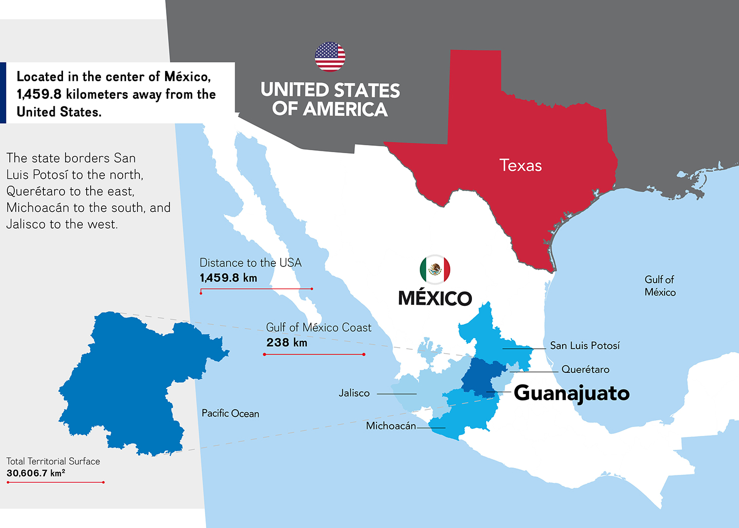 Guanajuato is a state located in the central region of Mexico, with an area of 30,608 km², representing 1.56% of the country's total area. This strategic location places Guanajuato in a privileged position for economic development and connectivity with other regions of Mexico.