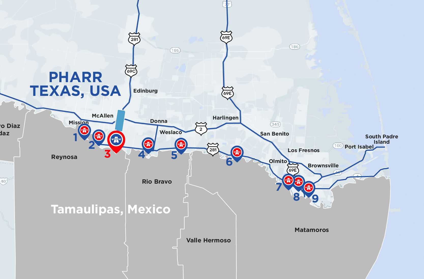 The Pharr-Reynosa International Bridge is one of the most important, connecting U.S. 281 to the City of Reynosa, Tamaulipas, making Pharr one of the most attractive logistical points in the region.