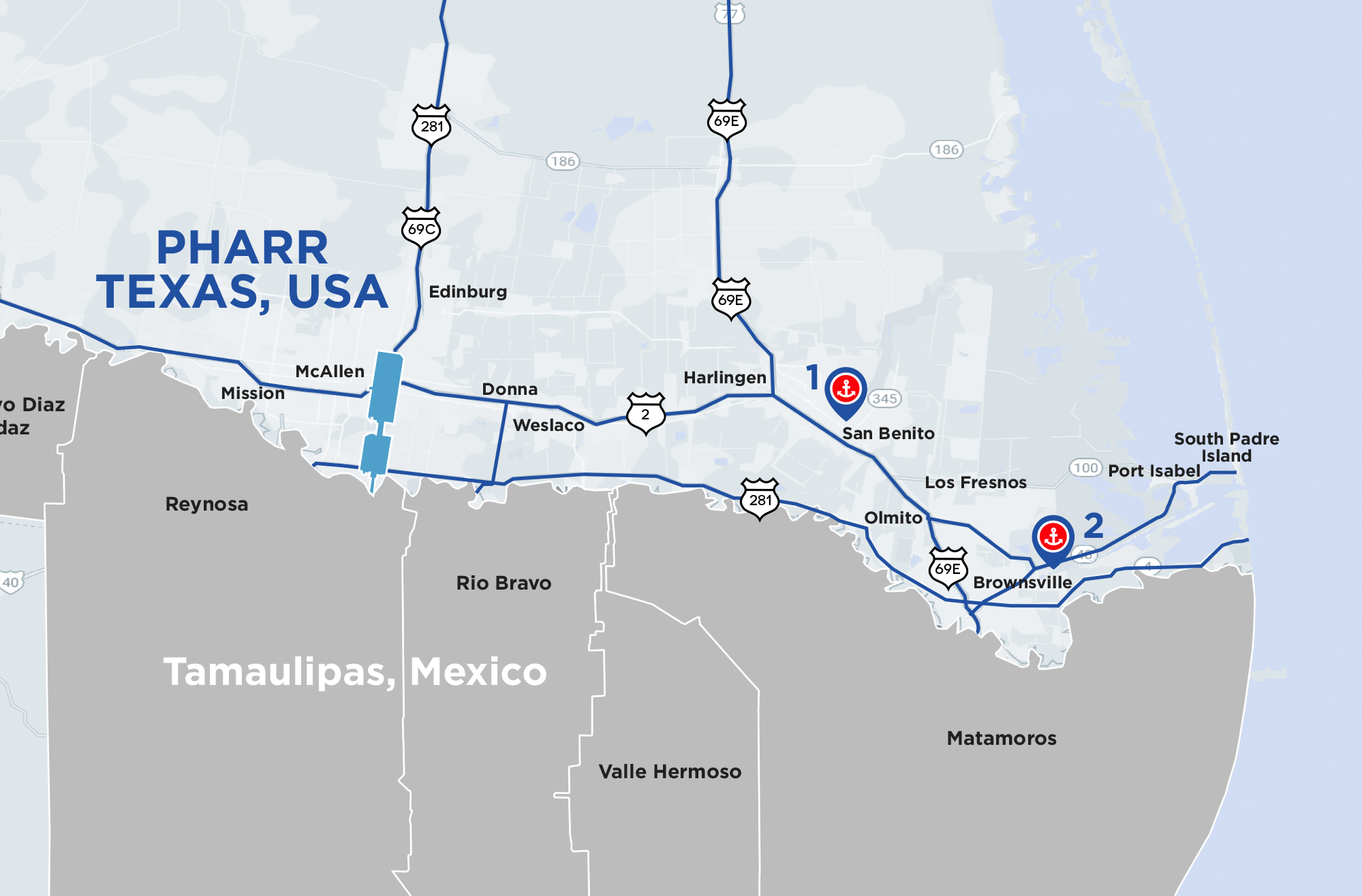 Pharr, Texas, doesn´t have direct access to the sea, it benefits from the marine connectivity of the region. The city is part of a network of highways that connect cities’ major activity centers, marine ports, and ports of entry.