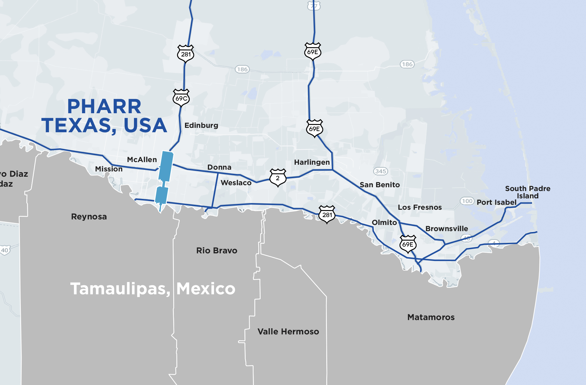 Pharr-Reynosa International Bridge connects U.S. 281 to Reynosa, Tamaulipas, making Pharr one of the most attractive logistical points in the region.